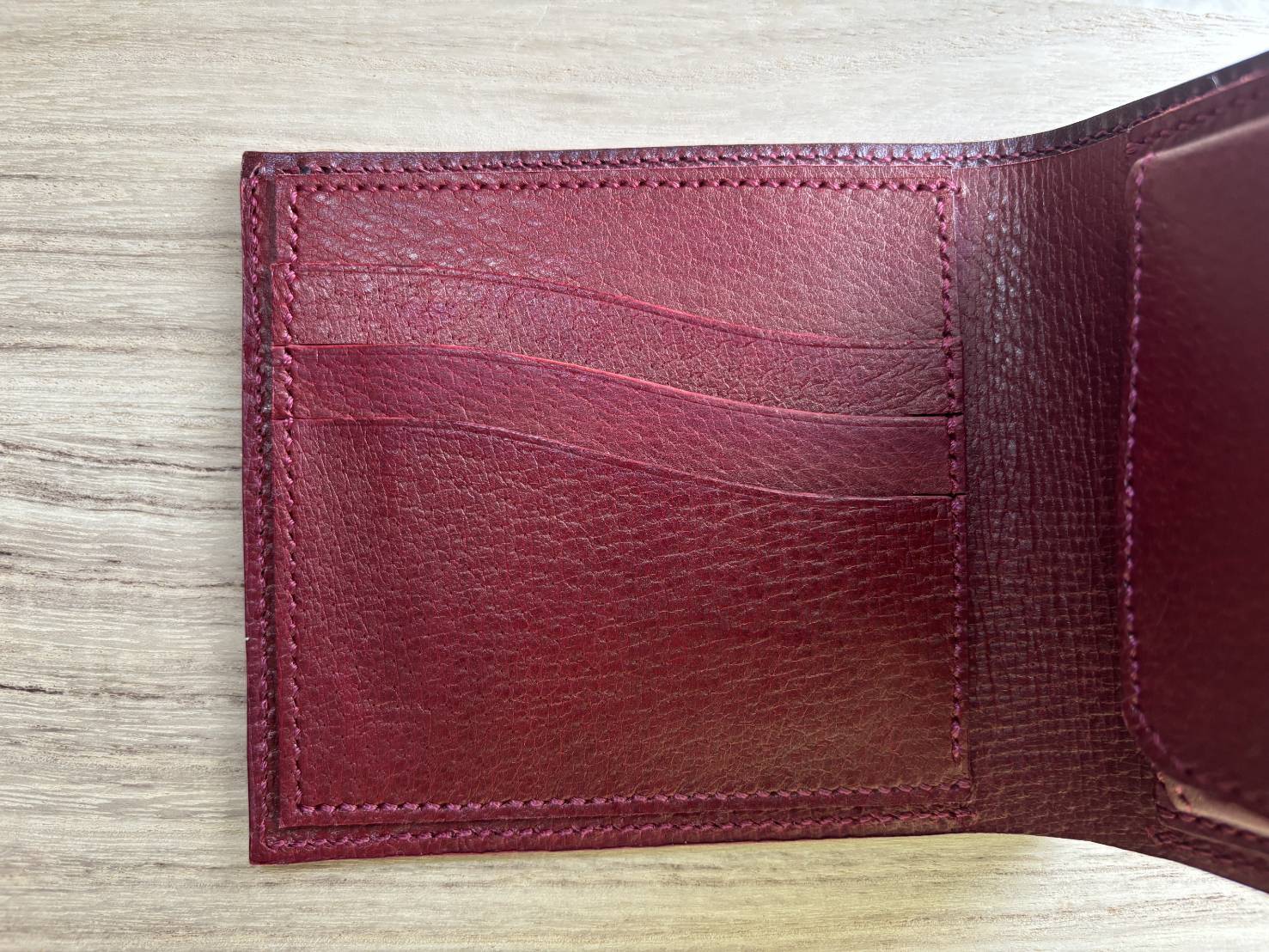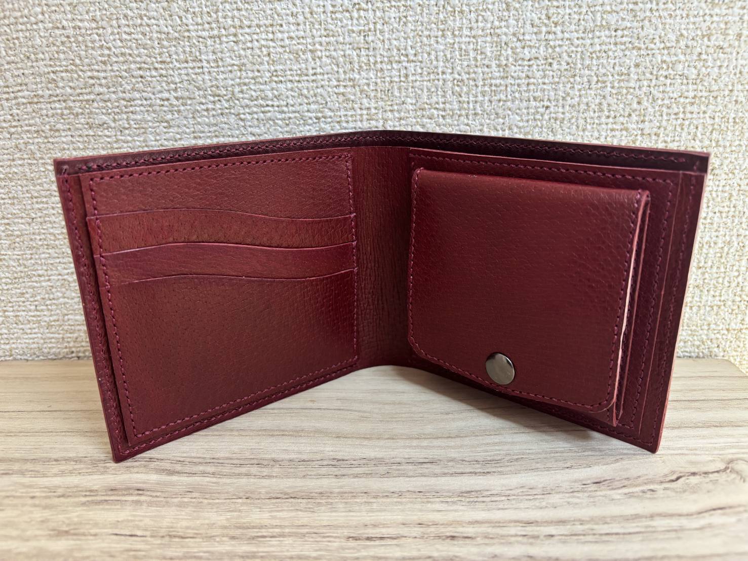 上質なベルギー産のルガトショルダーを使用して製作した、スタイリッシュな二つ折り財布です。美しい発色としなやかな質感が特徴で、シンプルながらも高級感のあるデザインが魅力です。裁断から接着、縫製まで全て手作業で仕上げています。しっとりとしていて手に馴染む本革の手触りをお楽しみ下さい。