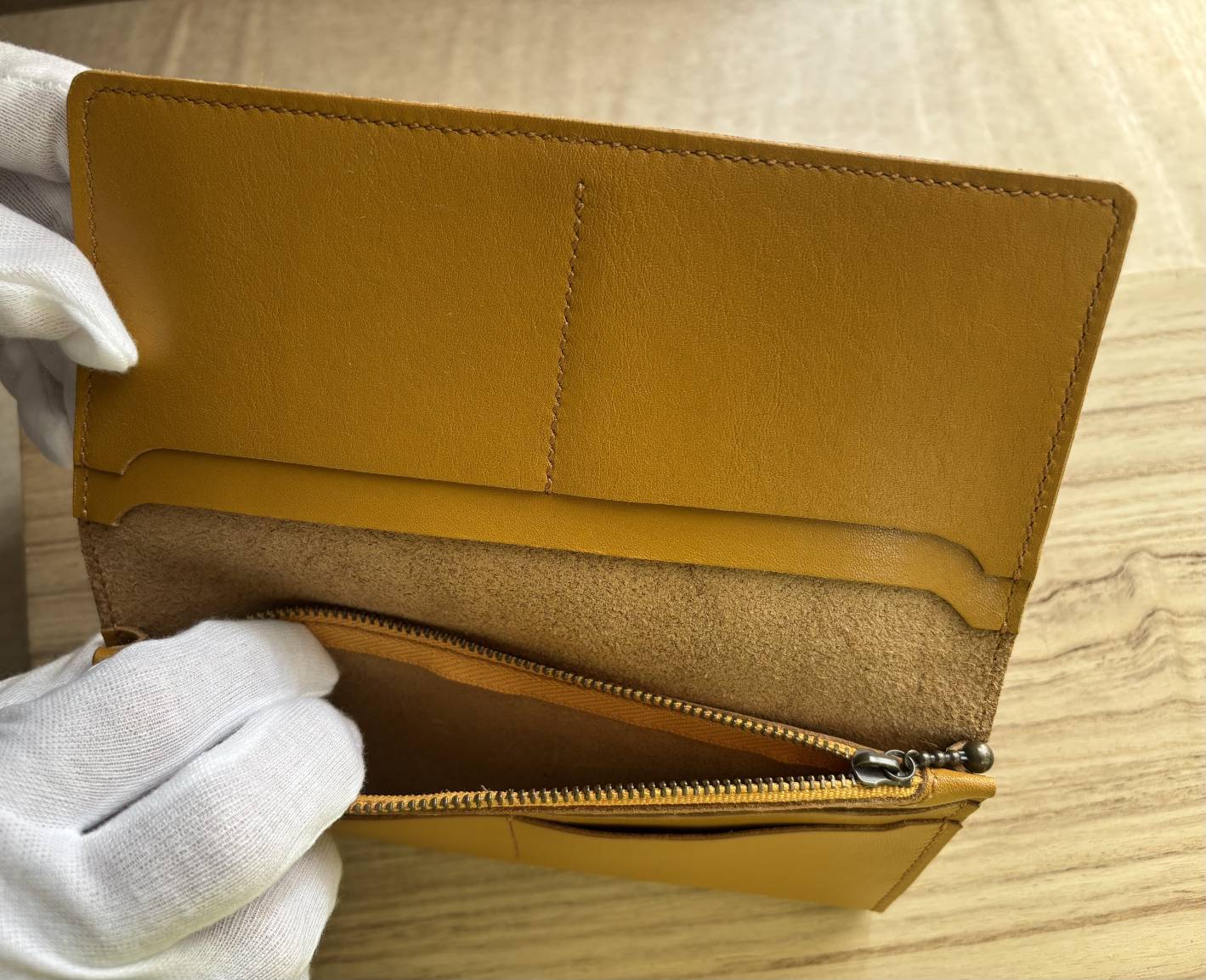 上質な本牛革を使用して製作した、シンプルで洗練された長財布です。しっとりとした質感が特徴で、程よい厚みのイエローカラーの革を使用しています。マチを取っているのでお札を折ること無く20枚程度は収納する事が出来ます。コインポケットはファスナー開閉式で、硬貨が30〜40枚程度入れられます。
