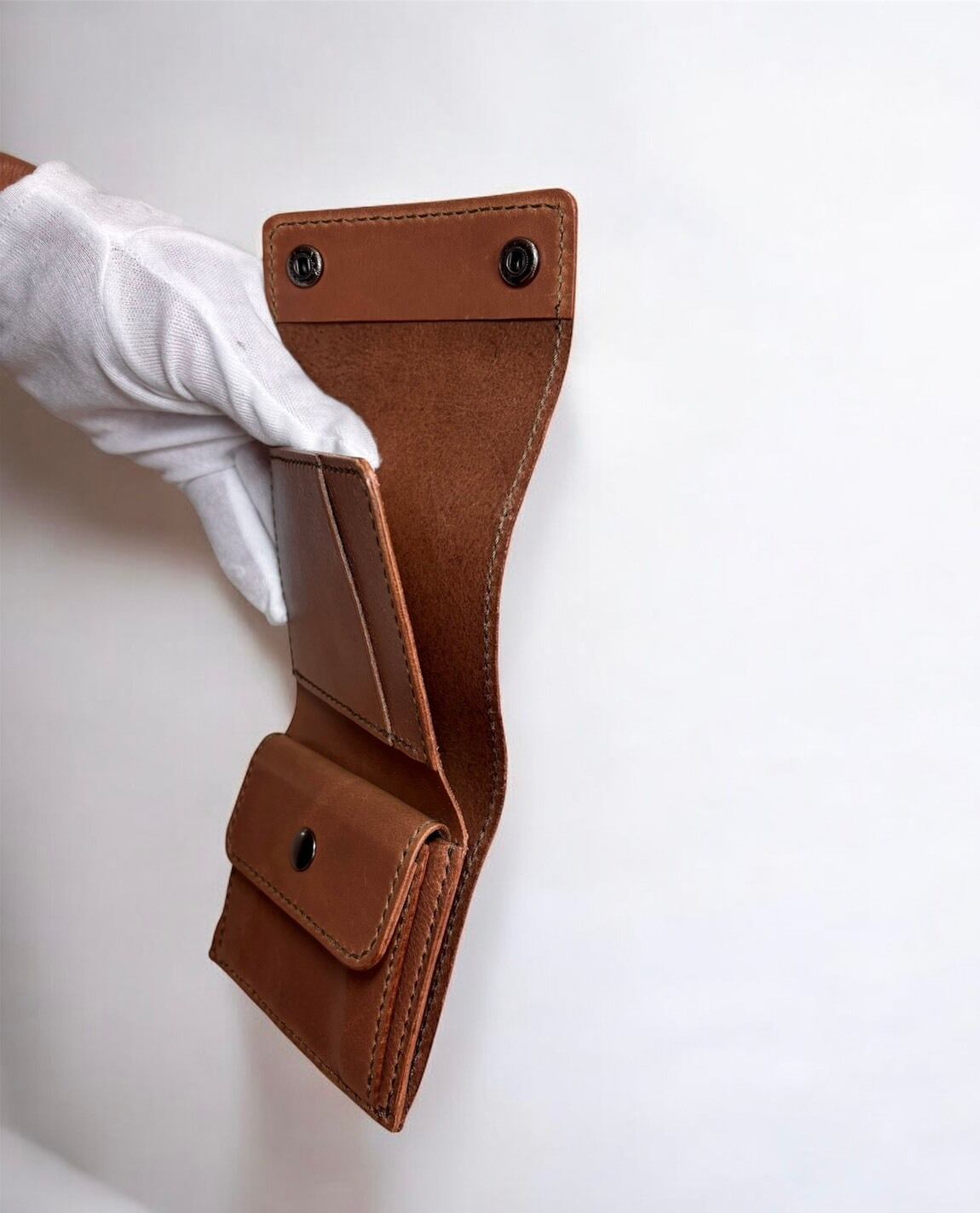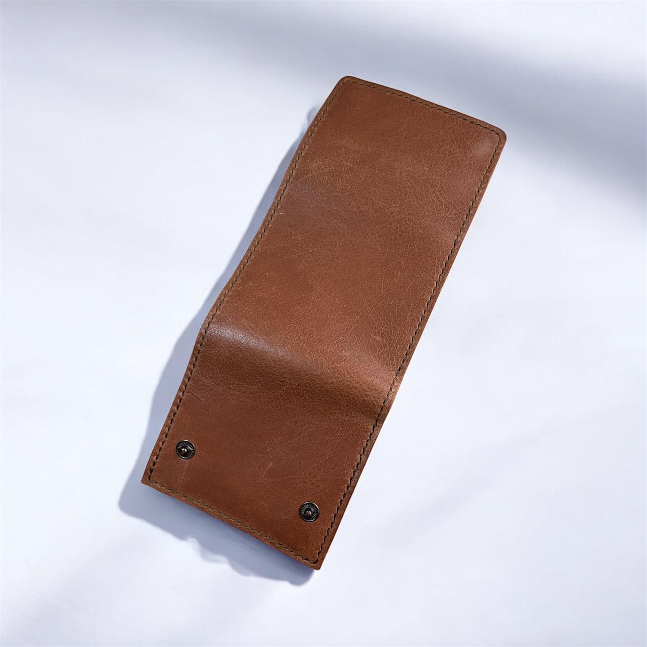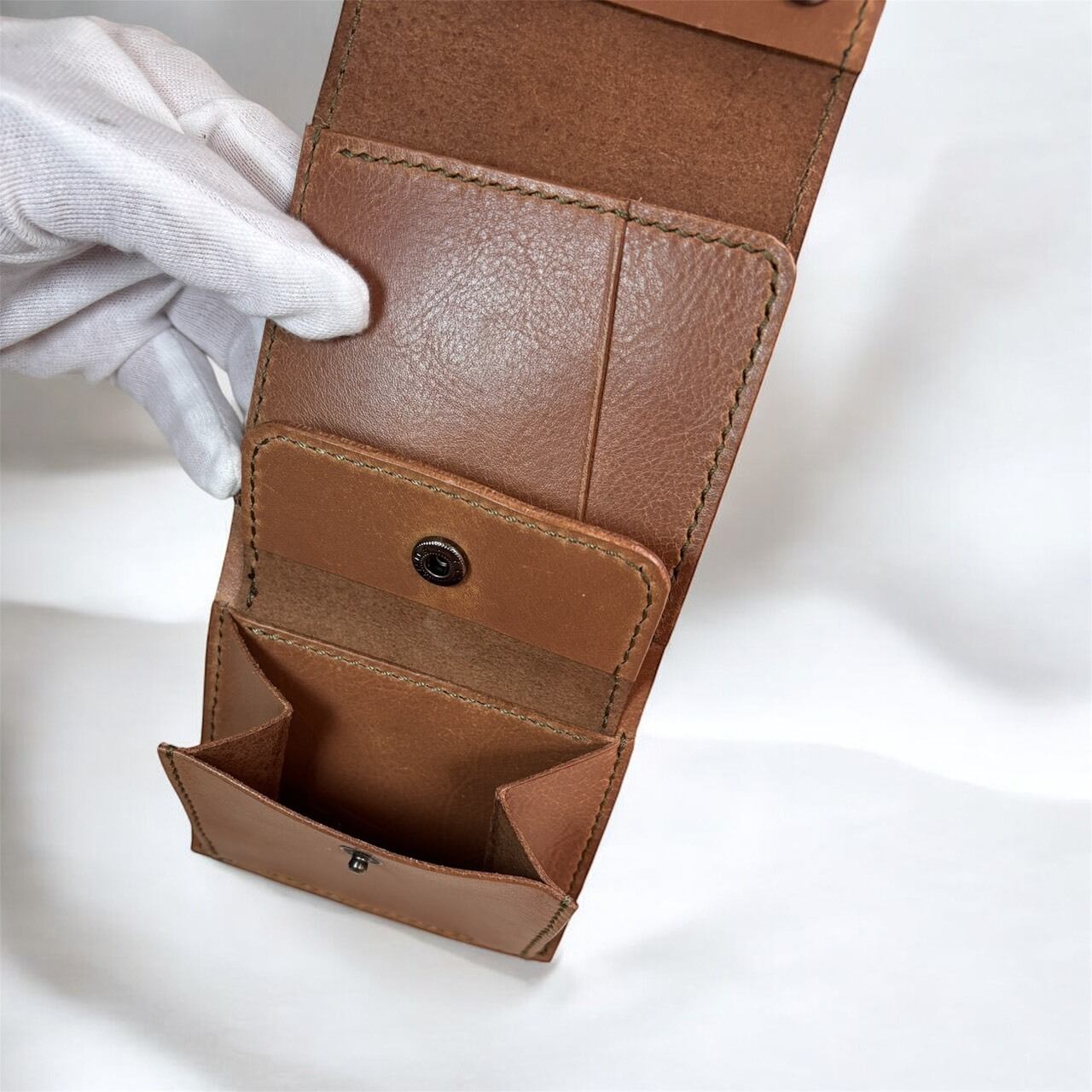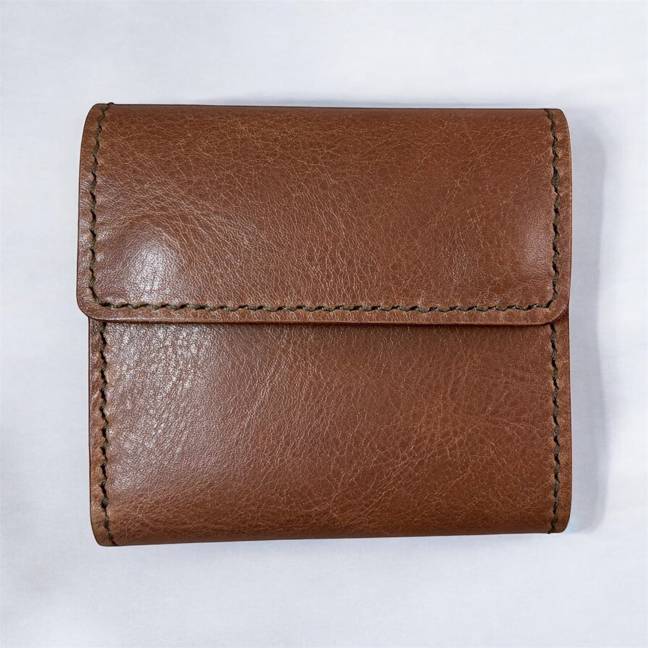 上質な本牛革を使用して製作した、コンパクトで軽やかな二つ折り財布です。しっとりとした質感が特徴で、シンプルながらも洗練されたデザインが魅力です。お札やカードが効率よく収納できる設計で、小さなバッグにもぴったりフィットします。